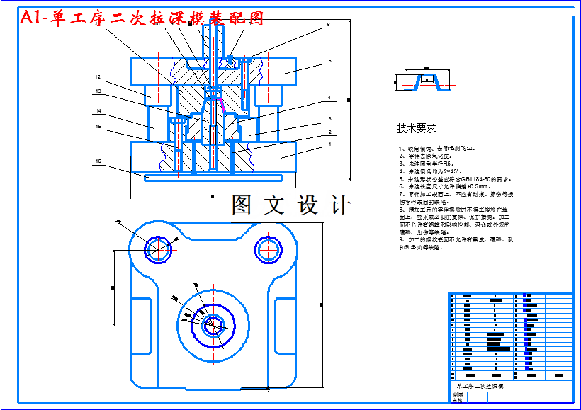 该零件结构较简单、形状对称,完全由圆弧和直线组成,利用普通冲裁方法可以达到零件图样要求。该零件为深锥形件(相对高度H/d=20/32.6=0.85>0.8),料厚t=1.5mm,拉深后厚度不变;零件底部圆角半径r=2mm,拉深直径公差为12级,其余尺寸公差都为自由公差,满足拉深工艺对精度等级的要求。采用了落料与拉深复合模,提高了生产率,对落料以及拉深的精度也有很大的提高。由于剩余三道冲压工序是在单工序模中完成,中间过程需要取件,二次定位,精度和生产效率较低。但单工序模结构简单,制造成本低,便于制造,制造周期短。
