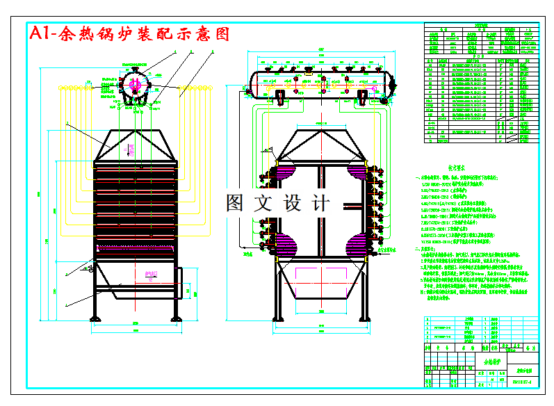 本设计“8万Nm3/h焦炉竖烟道烟气余热锅炉设计”正是基于这样的现实背景,设计一台余热锅炉以回收焦炉排放烟气的余热,生产出0.8MPa(g)的蒸汽以作生产工艺之用,达到节能减排和提高能源利用率的目的。在设计计算过程中,首先根据热平衡方程、烟气和水的进、出口温度、压力、流量等原始参数,计算出传热量;然后通过选择翅片管和径向热管规格及其结构参数,计算出总传热系数,最后确定翅片管和径向热管的数量及其排布方式。在烟气温度低于或接近露点腐蚀温度的省煤器上采用径向热管作为换热单元,在烟气温度高于露点腐蚀温度的蒸发器区域采用翅片管。这样设计能够在提高换热系数的同时解决金属结构的低温腐蚀问题。合理选择烟气工况流速,对传热管进行合理排布,使烟气侧的阻力降达到要求,不影响焦炉生产、破坏焦炉的压力操作。在合理选择烟气工况的同时对翅片间距进行合理选取,保证烟气的自清灰能力。余热锅炉采用自然循环,以传热量最大的首组翅片管束作为传热量的依据,在计算过程中选取合适的循环倍率和循环回路高度,计算出回路的流动阻力和运动压头,保证锅炉自然循环回路运行正常。