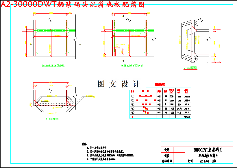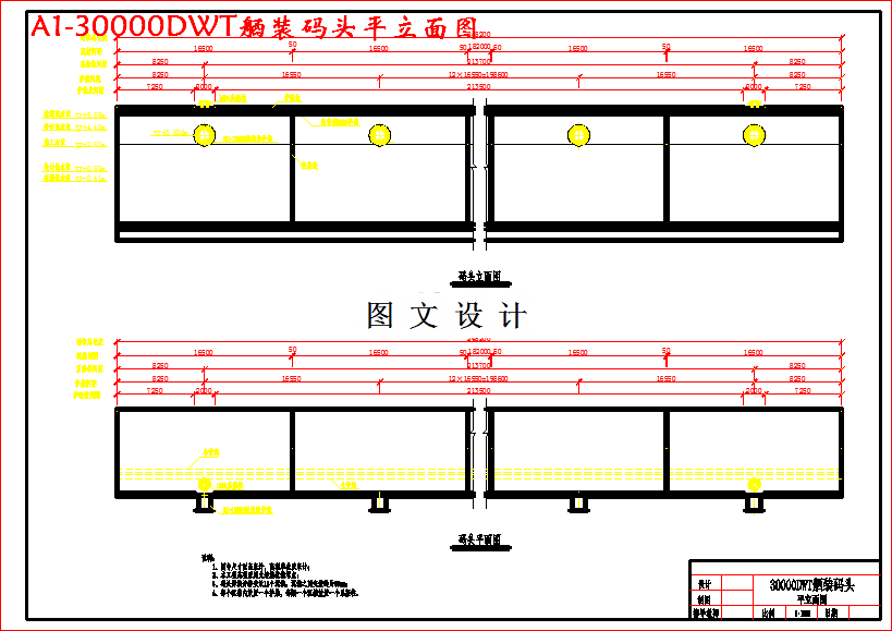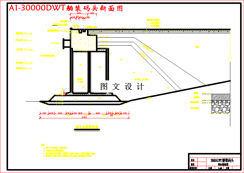 本工程为一座3万吨级舾装码头泊位设计及其东岸护岸的断面设计,主要有码头总体平面布置、码头断面设计、结构计算、配筋及施工工艺和施工方法等。本设计首先依据码头处的自然条件以及《海港总体设计规范》(JTJ 165-2013)的要求,确定码头的总体平面布置,主要包括有水域布置和陆域布置,其中水域布置包括航道和码头前沿水深,陆域布置包括堆场面积、车道等,还计算出码头各部分的主要尺度并进行了沉箱浮游稳定性验算。根据《重力式码头设计与施工规范》(JTS 167-2-2009)、《水运工程混凝土结构设计规范》(JTS 151-2011)等,结合港区荷载分析作用效应组合,验算码头地基承载力、基床承载力、沉箱抗倾抗滑稳定。确定在各种荷载作用下对构件进行承载能力极限状态和正常使用极限状态的作用效应组合,并对主要构件进行配筋及验算其裂缝宽度。最后计算码头工程量,分析码头的施工方法及施工方案,并且绘制了完整的设计图纸。