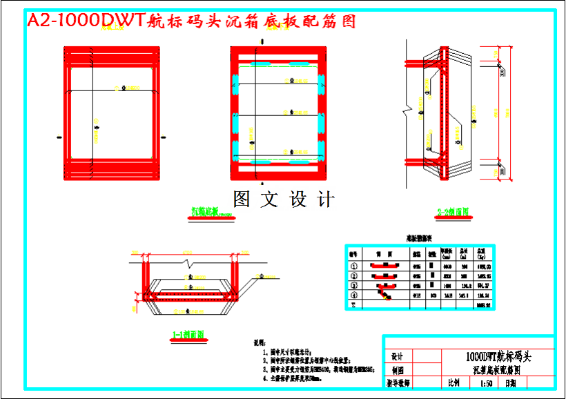 本工程为一座1000吨级航标码头泊位设计,主要内容有码头总体平面布置、码头断面设计、结构计算、配筋及施工工艺和施工方法等。本设计首先依据码头处的自然条件以及规范的要求,确定码头的总体平面布置,主要包括水域布置和陆域布置,其中水域布置包括航道和码头前沿水深,陆域布置包括堆场面积等。结构计算包括码头地基承载力、沉箱抗倾抗滑稳定验算。确定在各种荷载作用下对构件进行承载能力极限状态和正常使用极限状态的作用效应组合,并对主要构件进行配筋及验算其裂缝宽度。最后计算码头工程量,分析码头的施工方法及施工方案。