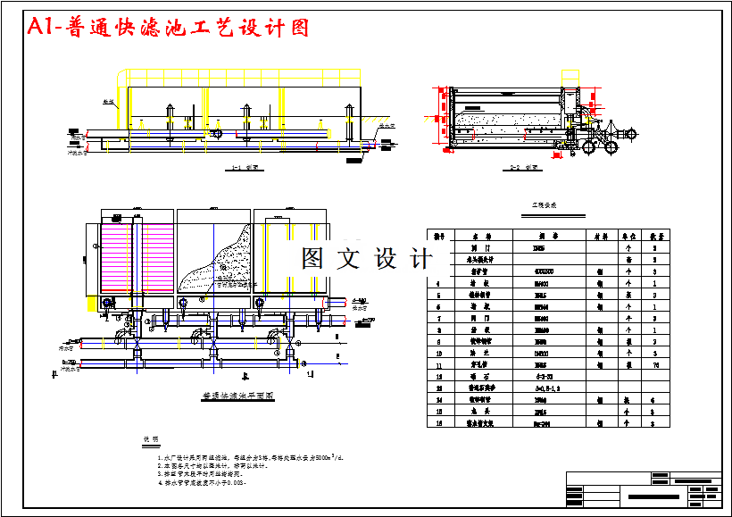 给水系统是保证城市,工矿企业等用水的各项构筑物和输配水管网组成的系统,它主要包括从水源地取水,按照水质要求进行处理,然后将水通过输配水管网送到城市用水区,LY县此次的设计主要包括以下几个方面: 1.取水工程设计,这次方案选用城市东南部的地下水源,由于城市用水量比较大,因此此设计开采八口井,其中一口井为备用井。具体设计见设计第三章,城市的地表水源为黄河提水西线工程,输水管道预留口在县城西北部19KM外,采用岸边式取水。 2输配水工程设计,设计了两套方案,一套是分区供水,一套是两个水源统一集中供水。经过选择采用两水源统一集中供水。 3.净水厂设计,同样采用了两套方案,一套选用机械絮凝池,斜管沉淀池和普通快滤池作为一套工艺,另一套工艺选用机械澄清池和V型滤池,经多方面考虑,最后中选第一套方案。