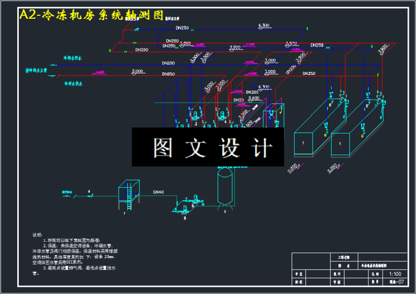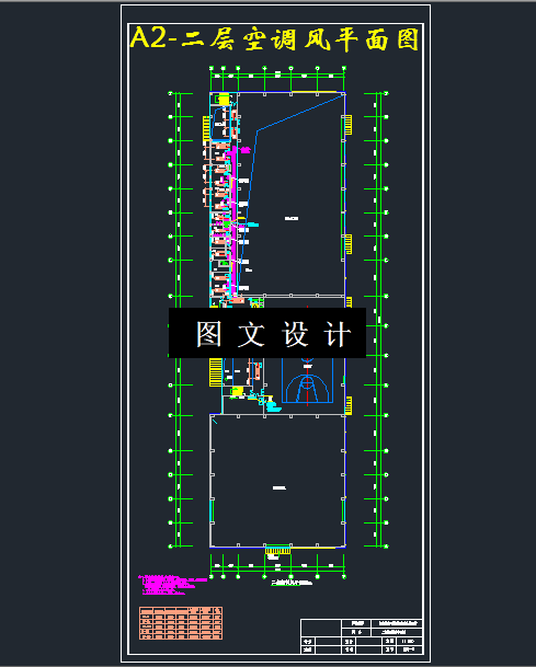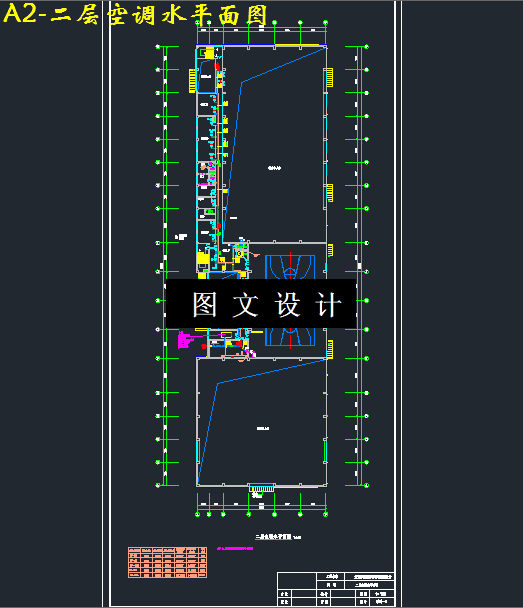 本设内空调系统设计。在设计中,进行夏季冷负荷和冬季热负荷的计算。决定采计是某体育中心空调系统设计,主要任务是完成冷冻站和室用电制冷中央空调系统加城市热网的方案,根据各不同功能空间(特别注意有大空间),如游泳馆、健身房等,设计不同的空调末端:如风机盘管加独立新风、一次回风等系统。空调主机螺杆式制冷机组:LWWS-1200,制冷(热)量为438KW两台。夏季:2台螺杆式制冷机组全部开启运行,供给空调系统7/12℃的冷冻水,冷量由冷却塔提供;冬季由市政热网通过板式换热器供给空调系统和普通散热器采暖系55/45℃的热水,热量由市政热网提供,不同季节运行工况的转换靠阀门的切换实现。在冷负荷计算的基础上完成主机和风机盘管的选型,并通过风量、水量的计算确定风管路和水管路的规格,并校核最不利环路的阻力和压头用以确定新风机和水泵。依据相关的空调设计手册所提供的参数,进一步完成新风机组、水泵、制冷机组等的选型,从而将其反应在图纸上,最终完成整个空调系统设计。