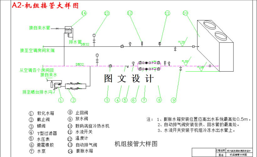 本次设计为268 m2户型别墅设计中央空调系统,拟为之设计经济合理的中央空调系统,为住户提供舒适的生活环境。设计空调总面积约为260 m2,夏季空调制冷,冬季制热。机组选用经济性的数码涡旋冷热水机组,空调系统采用风机盘管加新风系统,卧室的风机盘管采用壁挂式,客厅和餐厅的风机盘管采用卡式系列。房间的新风补给依靠门窗缝隙的渗入。别墅主要由卧室、客厅和活动室组成。从经济性、实用性、舒适性等要求出发,本设计对各个房间分别进行控制。针对住户的要求和特点,以及该地的气象条件,参考有关文献资料对该楼的中央空调系统进行设计,为室内人员提供舒适、卫生的工作环境。本设计依据有关规范,力求达到经济、舒适、卫生、实用,并尽可能满足节能的要求。本设计的内容包括:建筑冷热负荷、湿负荷逐时计算;冷热源的选择;系统方案的确定;空调末端处理设备的选择;水系统的设计计算;冷冻水管道设计计算、膨胀水箱的选择和软化水箱的选择等。
