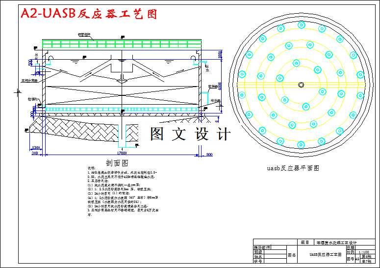 本设计内容是啤酒废水处理工艺设计,设计处理废水为特种废水,设计规模为5000m3/d。设计进水的水质;废水处理站出水的出水水质执行《》GB8978-1996一级A标准,即处理后出水水质为:。根据各种工艺方案优缺点的分析以及本设计的实际情况,最终选定UASB+SBR法作为本次废水处理站的处理工艺。在UASB+SBR法中,废水首先进入UASB反应器,再进入SBR池。该方法的处理工艺流程为:细格栅→集水池→废水提升泵房→调节池→UASB反应器→SBR池→出水。剩余污泥在集泥井中收集,经过污泥浓缩池浓缩,再经过污泥脱水车间脱水,然后制成泥饼外运。废水处理站站区内包含:各种处理单元构筑物;连通各构筑物之间的管道及其他管线;辅助性构筑物;道路、预留地及绿地等。由于主导风向为西南风,所以各构筑物主要走向自西向东,生活工作区设在站区南侧,污泥处理区设在偏东方向。
