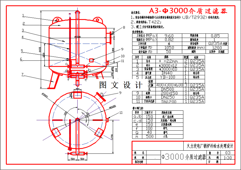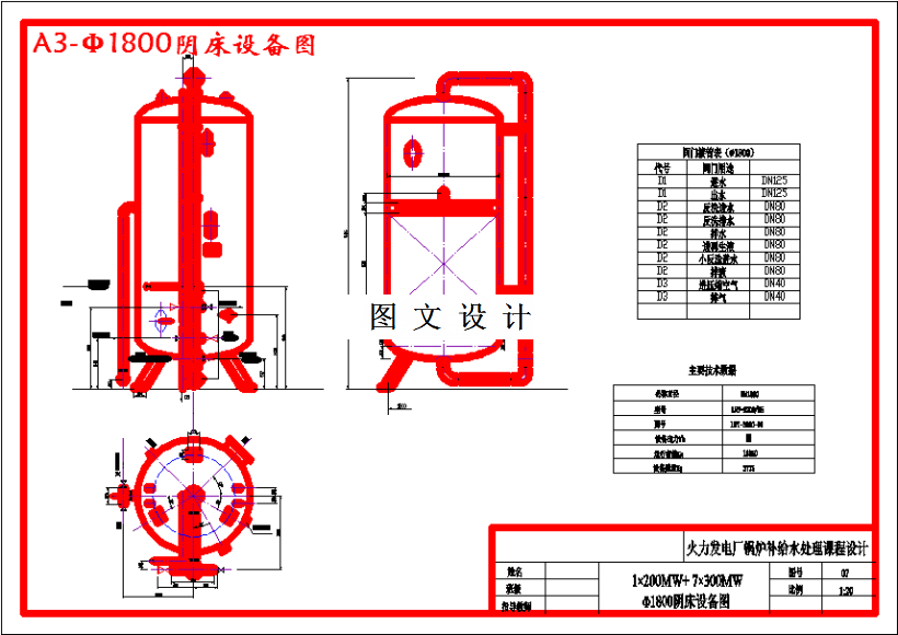 1×200MW+7×300MW机组火力发电厂锅炉补给水处理课程设计(夏季水质),根据要求对自己课题(1×200MW+7×300MW机组)水处理系统进行了设计、计算,根据水源水质、总出力及各项水质指标要求比较,选择适合的水处理方案及设备,同时绘制了总体平面布置图、工艺流程图和主要设备结构示意图。补给水处理工艺流程是根据原水为湘江水、出水水质要求和机组容量的大小等因素综合确定的。 (1)原水水质悬浮物含量(实际含量为给出)大于50mg/L。因此需采用澄清池,过滤系统应用单层(石英砂)无阀滤池,采用接触混凝过滤方式,在反洗过程中,可以自动进行,无阀滤池的滤后水位位于滤池上部,便于操作人员观察,若水质不合格,能及时发现,及时处理,确保出水水质达标,其截污能力大,运行周期长,运行中水头损失增长较慢,实践中应用效果良好。 (2)除盐系统先采用弱碱—强碱复床+阳床一级除盐+混床交换系统,出水水质好能达到锅炉运行的要求。考虑经过无阀滤池混凝后,带入多余的强酸阴离子,强碱阴床不太符合水质要求,所以改用复床。 (3)原水水质全碱度为1.08mmol/L,大于0.5mmol/L,所以在阴床后面加设除碳器。体内再生混床选用直径为1.2m的两台,才能满足其实际运行流速的校验,所以不依据实际计算结果选用最佳的直径尺寸。
