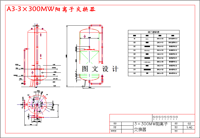 3×300MW机组火力发电厂锅炉补给水处理工艺课程设计(秋季水质),本设计根据《3×300MW火力发电厂锅炉补给水处理设计》的要求,结合《热力发电厂水处理》和《AutoCAD2000应用教程》等相关资料,根据水源、水质资料、电厂规模及水汽系统的水质指标等资料,通过计算选择恰当的水处理方案和主要设备,再运用CAD绘制设计出相应的主要单体设备图,并手工绘制工艺流程图、总体布局平面图。设计方案的是3×300MW火力发电厂锅炉补给水处理,是秋季水质。补给水处理工艺流程的选择是根据建厂的原始资料,如原水的水质和机组对水质和水量的要求等进行的,选择的方案能使处理后的水源水达到机组对水质的要求。包括预处理和后阶段处理两部分,因水源为河水,悬浮物含量较大,采用混凝,过滤处理;后阶段按照由前往后计算的顺序,(1).混床的确定:由水处理总供水量选择d=1500mm的定型混床,起截面积为1.76m2. ,选择正常时的混床台数为1台,最大为2台。(2).强碱阴离子交换器的选择,由前面混床设计的供水量确定阴床的供水量,进而确定阴床的总工作面积,选用直径为d=2000mm的定型阴床设备,其截面积为3.14,正常工作时的台数为1台,最大2台。(3).除碳器的选择,由前一级设备的总供水量确定除碳器的总供水量,选用直径d=1400mm的定型设备,其截面积为1.54,最大选择2台除碳器.(4).强酸阳离子交换器的选择,,由前面除碳器设计的供水量确定阳床的供水量,进而确定阳床的总工作面积,选用直径为d=2000mm的定型阴床设备,其截面积为3.14,正常工作时的台数为1台,最大2台。(5). 无阀滤池的选择,由滤池设计的供水量选择3台滤池的设备台数。