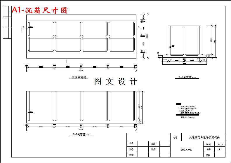本次设计的内容是大连棉花岛渔港沉箱码头,地理位置在大连棉花岛的南侧,坐标为北纬 39°0′38″,东经 121°40′42″。在棉花岛处建立渔港有优越的天然条件且位于市中心与经济技术开发区中间部位,以大连港为依托,水路、陆路交通条件极 好,地理位置优越。 该区水域开阔,东南向及南向为敞海,受到大连湾周边地形的演化,除南向及东南向波浪直接作用港区外,其他方向波浪掩护条件较好,港区外侧即为大连港棉花岛航道,可满足大马力渔船及冷藏加工船的进出港作业要求。 本次设计的内容是在充分运用规范的基础之上进行码头总平面布置图设计、码头各构件的设计、码头稳定性验算、结构内力计算、沉箱的配筋及裂缝宽度计算,以及码头总平面图、码头三视图的绘制。