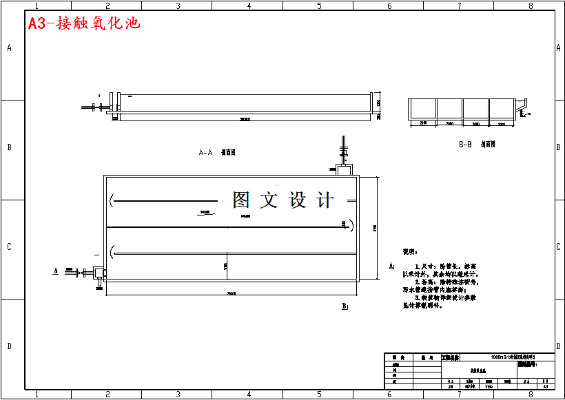 本设计为 10000m3/d 每天污水处理厂工艺设计,通过查阅资料,工艺选择, 构筑物设计计算,平面、高程以及单体图的绘制,使我对城市污水处理厂的设计 计算过程有了较为深入的认识和理解,达到了设计训练的目的。 本设计包括以下内容: CAD 图纸 5 张:平面布置图 1 张 高程布置图 1 张 SBR 反应池单体图 1 张 接触氧化池单体图 1 张 浓缩池单体图 1 张 SBR 是一种间歇式的活性泥泥系统,其基本特征是在一个反应池内完成污 水的生化反应、固液分离、排水、排泥。可通过双池或多池组合运行实现连续进 出水。SBR 通过对反应池曝气量和溶解氧的控制而实现不同的处理目标,具有 很大的灵活性。SBR 池通常每个周期运行 4-6 小时,当出现雨水高峰流量时,SBR 系统就从正常循环自动切换至雨水运行模式,通过调整其循环周期,以适应来水 量的变化。SBR 系统通常能够承受 3-5 倍旱流量的冲击负荷。