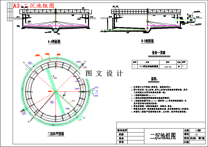 10000立方∕天生活污水综合处理设计。本项目设计进出水水质根据生活污水来源和《城镇污水处理厂污染物排放标准GB18918-2002》一级A标准列出,采用基本控制项目最高允许排放浓度。由于CODcr、BOD5 、SS、NH3-N、P去除率均较高,需采用生物处理法。选用A2/O工艺,同时对污泥和臭气进行处理。设计图集:平面布置图、高程图、主要构筑物结构图、设备一栏表、材料一栏表。