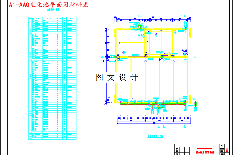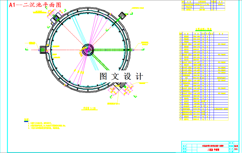 本设计的主要设计参数如下:曝气沉砂池:水力停留时间:2 min生化反应池:总水力停留时间:12.7 h(选择区 1.0 h,厌氧区 1.5 h,缺氧区 2.2 h,好氧区 8.0 h)生化段污泥总负荷:0.15 kgBOD5/(kgMLSS·d)生化段总泥龄:15d污泥浓度 MLSS:3.5 g/L混合液内回流比:200%综合污泥产率:0.6 kgMLSS/kgBOD5二沉池:水力停留时间:2.5 h设计水力表面负荷:0.95 m3/(m2·h)混凝反应池:水力停留时间:5 min加药沉淀池:水力停留时间:2.5 h设计水力表面负荷:1.47 m3/(m2·h)滤布滤池:总过滤面积:144 m2紫外消毒池:照射剂量:28mJ/cm2本设计采用的 A2/O+混凝沉淀+滤布滤池+紫外消毒工艺,是传统工艺与新兴技术的结合,出水水质好,占地面积适量,且运行费用低廉,管理方便。经计算论证,本设计预期水质高于国家《城镇污水处理厂污染物排放标准》的一级 A 标准的相关水质要求。污水处理厂厂区总体布置分 区功能明确,水利通畅,管理方便,绿化覆盖率满足设计要求。