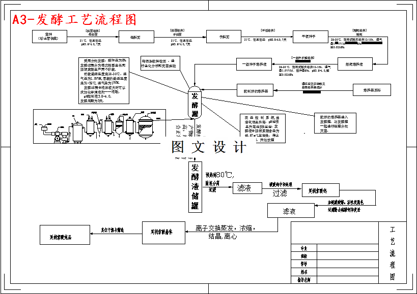 延胡索酸,又名富马酸、紫堇酸或地衣酸,即反丁烯二酸(IUPAC名为(E)-丁烯二酸),是一种无色、易燃的晶体,由丁烯衍生出的羧酸。它的化学式是C4H4O4。燃烧延胡索酸会释出带有刺激性的顺丁烯二酐烟熏。它的味道像水果,并在延胡索属、牛肝菌属、地衣及冰岛海苔中可以发现。 1.设计内容:包括菌种选育、培养基的设计及灭菌、空气除菌(如为需氧发酵)、种子的扩大培养、发酵过程中的控制参数和下游加工等,并由此形成一套完整的年产2吨延胡索酸的发酵生产工艺。 2.设计要求: ① 按照年产量要求进行工艺设计,不得造成设备浪费,节约人力、物力和能源。 ② 进行简单的物料衡算。 ③ 绘制设计图,要求至少一张工艺流程图和一张主设备结构图纸。 ④ 产品作为饲料添加剂,设计工艺流程时注意安全性。