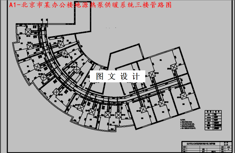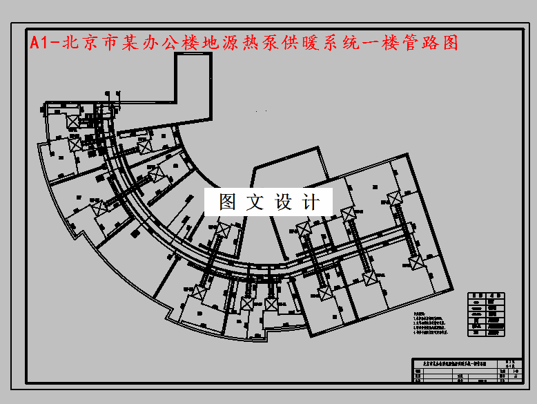 本课题是对北京某三层办公楼地源热泵供暖系统的设计,首先进行热负荷计算,根 据当地气象条件和设计要求温度计算出各办公室的围护结构基本热耗量,进行朝向修正, 得出修正耗热量,再算出冷风渗透耗热量,冷风侵入耗热量,从而得到各房间耗热量,进 而求得整栋办公大楼的耗热量。然后根据各房间的耗热量为各房间选择合适的风机盘管, 进行管路设计画出系统原理图。然后进行水力计算,采用假定流速法算出各管段的直径和 流速,根据流速算出雷诺数,求出摩擦阻力系数进而求出每米管长的沿程阻力损失,可以 求出各管段沿程阻力损失,再求出阀门,弯头,三通等造成的局部损失以及各风机盘管的 阻力损失。各部分阻力损失之和为供暖系统总的压力损失。根据整栋楼的耗热量选择相匹 配的地源热泵机组。根据阻力损失选择相匹配的循环水泵。