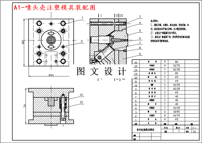 本产品是日常生活中化妆品或杀虫剂等塑料瓶上常见的喷头壳,且实用性强。该产品设计为大批量生产,故设计的模具要有较高的注塑效率,浇注系统要能够自动脱模,此外为保证塑件表面质量采用侧浇口,因此选用单分型面注射模,侧浇口自动脱模结构。模具的型腔采用一模一腔平衡布置,浇注系统采用侧浇口成形,推出形式为推件板推出机构完成塑件的推出。