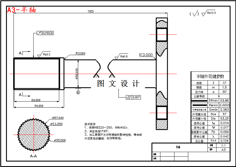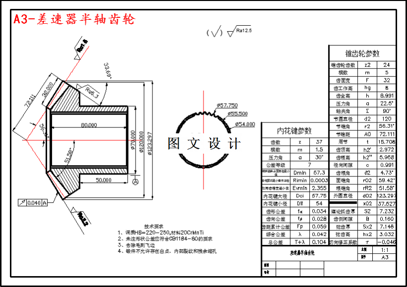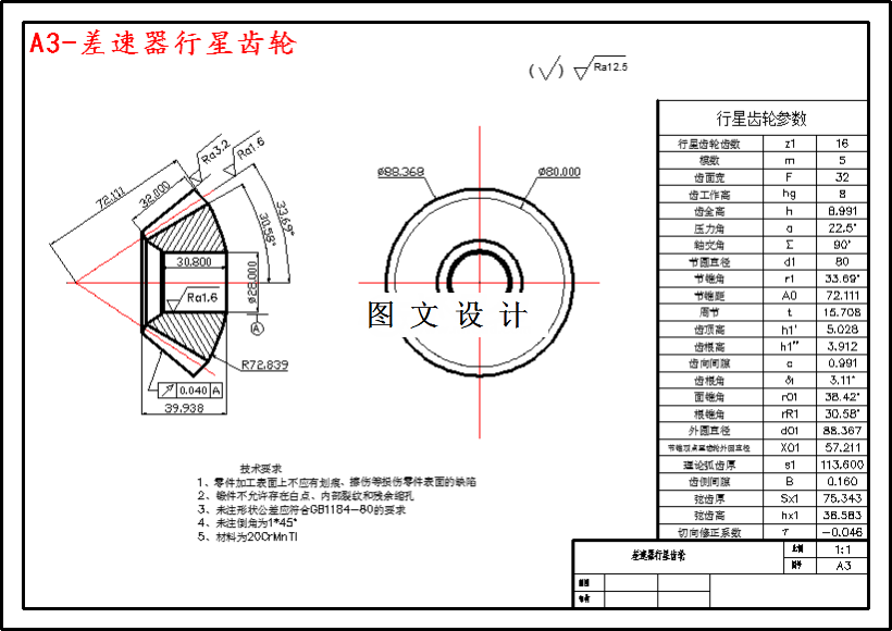 本设计对商用车驱动桥部分的差速器及半轴进行了设计和校核。根据给定的设计参数(发动机最大力矩,传动系传动比,驱动轮类型与规格,汽车总质量和使用工况,传动效率,驱动时后轴载荷转移系数,路面附着系数),选择驱动桥差速器总成的结构方案及零部件方案,协同设计出一套完整的差速器。设计过程遵从汽车设计的基本要求以及相应国际标准,设计、匹配、修改反复进行,最终成功得出商用汽车驱动桥部分的差速器及半轴的正确设计方案。总成取得成果如下: 1.依据使用要求选择了对称式圆锥行星齿轮差速器,针对差速器的基本参数进行确定,设计行星齿轮和半轴齿轮。 2.对设计出的行星齿轮和半轴齿轮根据格里森锥齿轮进行强度计算,经强度校核后 可知,初定数据均符合设计要求,载荷在允许范围之内。齿轮材料可选 20CrMnTi、20CrMoTi、22CrMnMo 和 20CrMo 等,此设计中选取 20CrMnTi。 3.根据工作条件,初选轴的材料为 40Cr,调质处理,采用全浮式半轴。根据计算 转矩确定半轴直径。半轴和半轴齿轮一般采用渐开线花键连接,对花键应进行挤压应力和键齿切应力验算。挤压应力和切应力均符合要求。