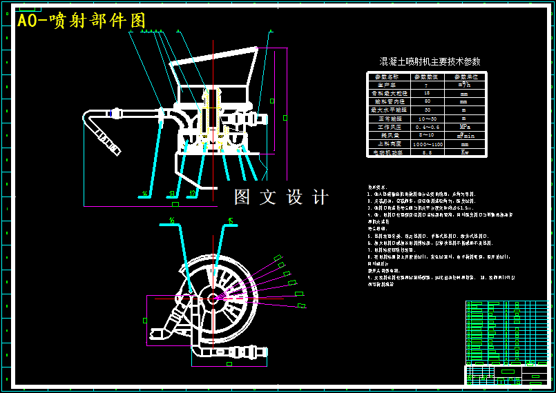 本设计系统地介绍了混凝土喷射机现在的情况和未来的发展方向及其工作原理、工作过程等,并阐述了常用机型的优缺点及其每种机型的工作场合和使用的范围,然后确定本次必要设计的机型。其次,联合本次任务书所要求的参数,采纳三级圆柱分流式直齿减速器、旋转体转子、给料系统、气压系统等一系列主要的零部件,并且对部分工作条件要求比较高的零件进行强度校核。