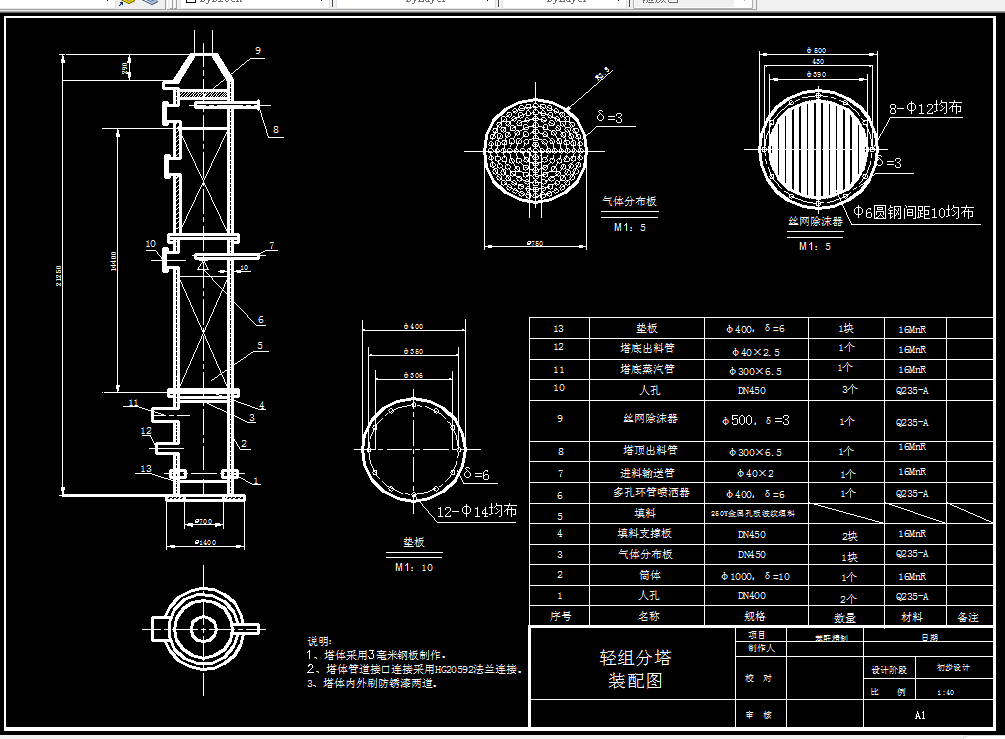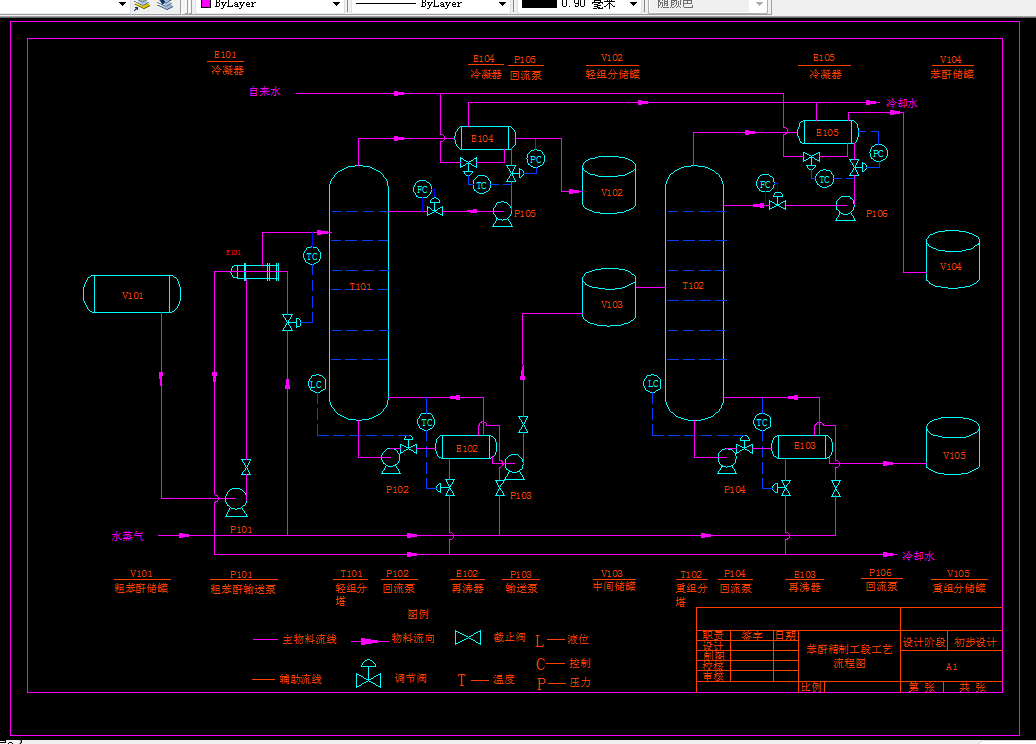 本设计确定年产10万吨苯酐的合理生产工艺;完成年产10万吨苯酐生产的全部工艺计算(物料衡算,热量衡算),根据工艺计算确定初馏塔,精馏塔的工艺尺寸;绘制工艺流程简图、带控制点的工艺流程图和精馏塔设备装配图。