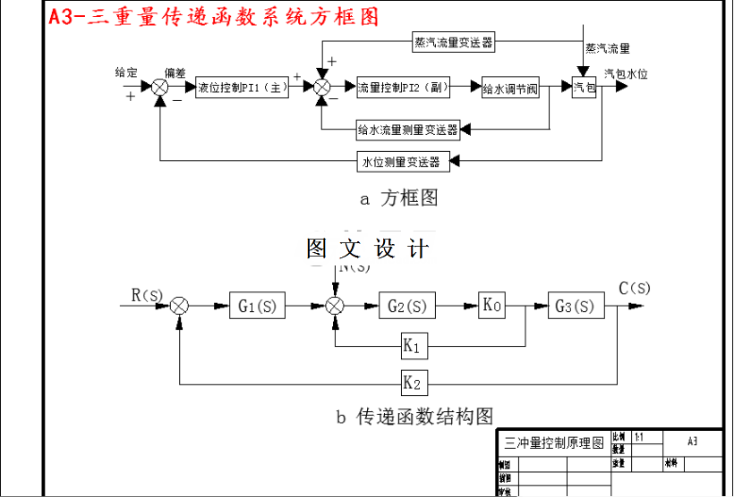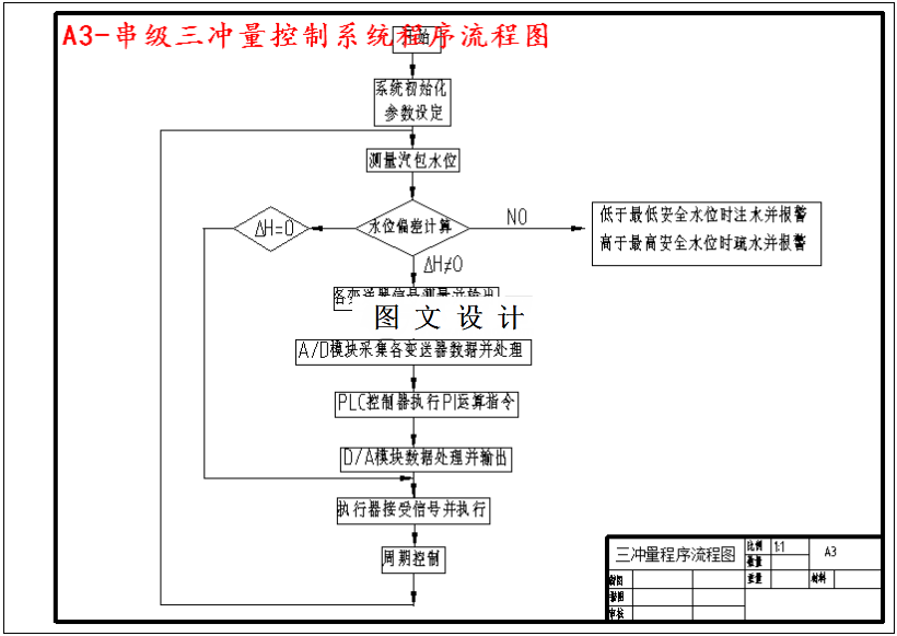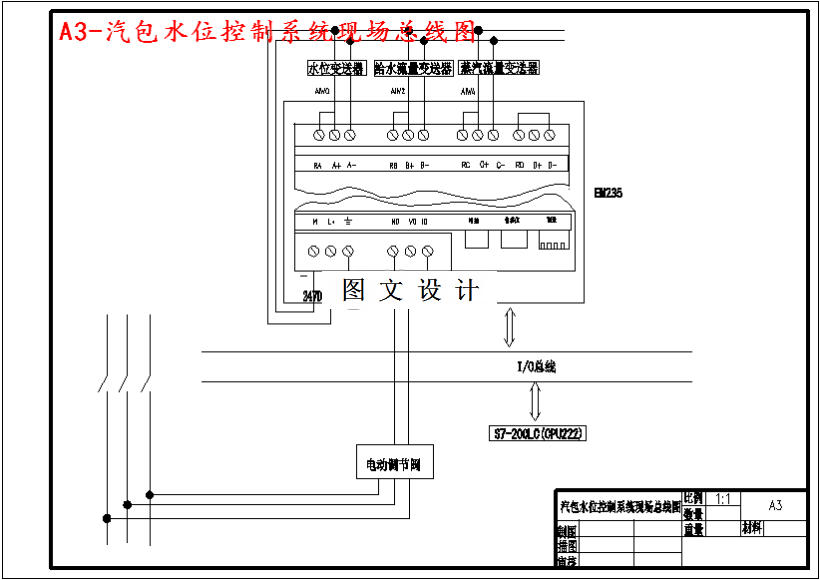 以75t/h流化床锅炉系统为对象对循环流化床锅炉汽包水位进行控制。采用三冲量水位控制系统,以锅炉水位为主控信号,蒸汽流量为前馈信号,给水流量为控制器的反馈信号;采用PLC控制器,设计适应该锅炉运行的控制系统。 技术指标 1.对锅炉水位,蒸汽量和给水量分别进行信号采集 2.现场自动检测仪表对生产中各个参数自动、连续地进行检测 3.通过下位机的控制,使锅炉汽包水位维持在正常的范围内。 当水位超过上限或下限时,能及时报警。锅炉的汽包水高度为汽包中线上下50mm。
