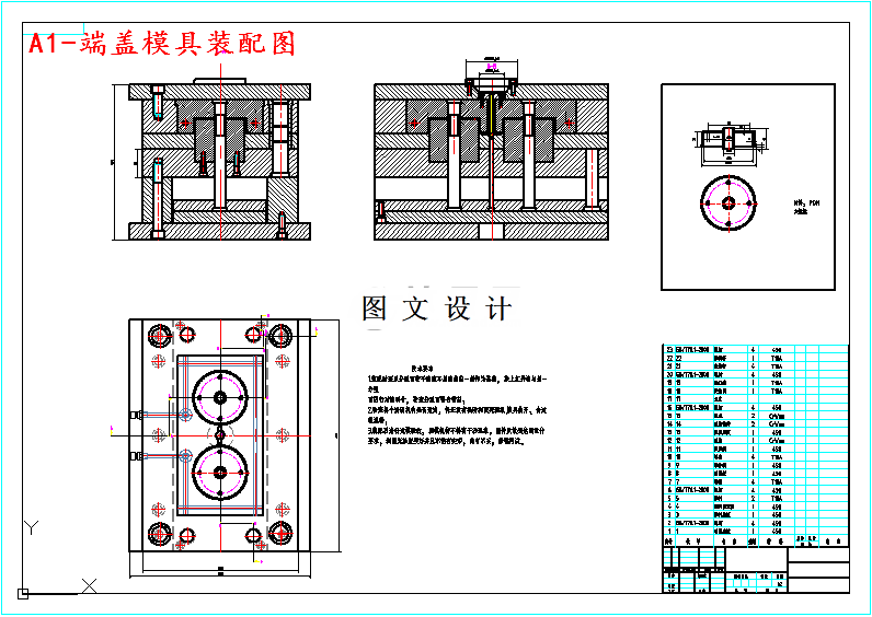 研究思路:端盖2注塑模具设计.在设计中经过分析选用了“一模两腔”的型腔排列方式,能够满足大批量的生产任务;浇口的设计过程中根据模具结构选择了侧浇口,在开模过程中能够自动切断浇口凝料,提高了生产效率;在顶出机构的设计中,考虑到制件成型后由于收缩将包紧在型芯上,造成脱模力较大,为保证塑件的质量,采用了顶杆脱模;设置了弹簧式优先复位机构,需要注意的是选用的弹簧要有迫使顶出机构复位的足够力矩。