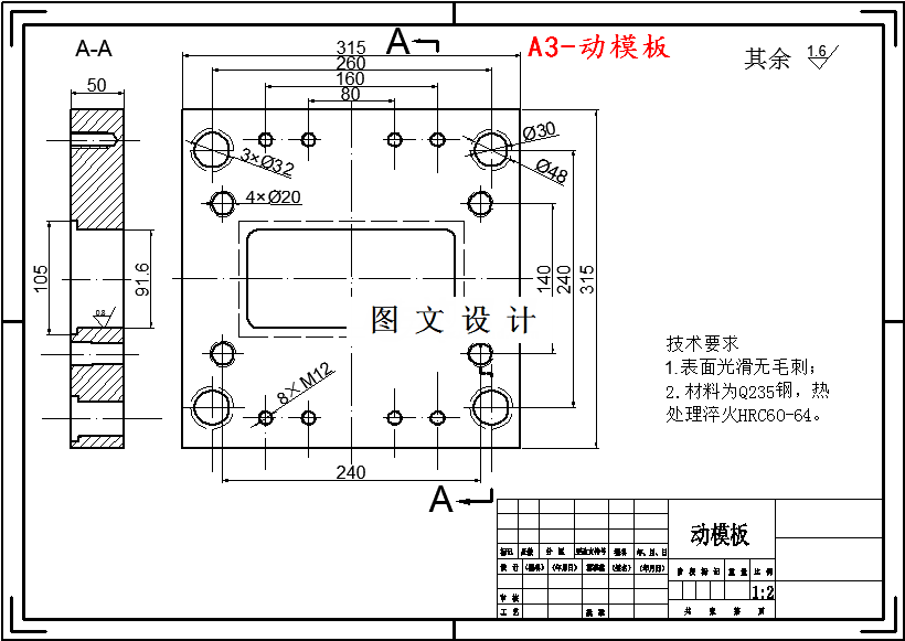 塑件较大,故采用一模一腔,平衡式排布。塑件表面质量包括有无斑点,条纹,凹痕,起泡,变色等缺陷,还有表面光泽度和表面粗糙度。表面缺陷必须避免。表面光泽度和表面粗糙度应根据塑件使用要求而定,尤其是透明塑件,对光泽性和表面粗糙度有严格要求。 塑件的表面粗糙度,除了在成型时从工艺上尽可能避免冷疤,波纹等疵点外,主要由模具成型零件的表面粗糙度决定。一般模具的表面粗糙度比塑件的表面粗糙度高一级。对于透明的塑件要求型腔和型芯的表面粗糙度相同,而不透明的塑件,则根据使用情况可以不同。 该塑件无特殊要求,为非透明制品,外表没有斑点及熔接痕,塑件内外表面Ra值取0.8μm。747013