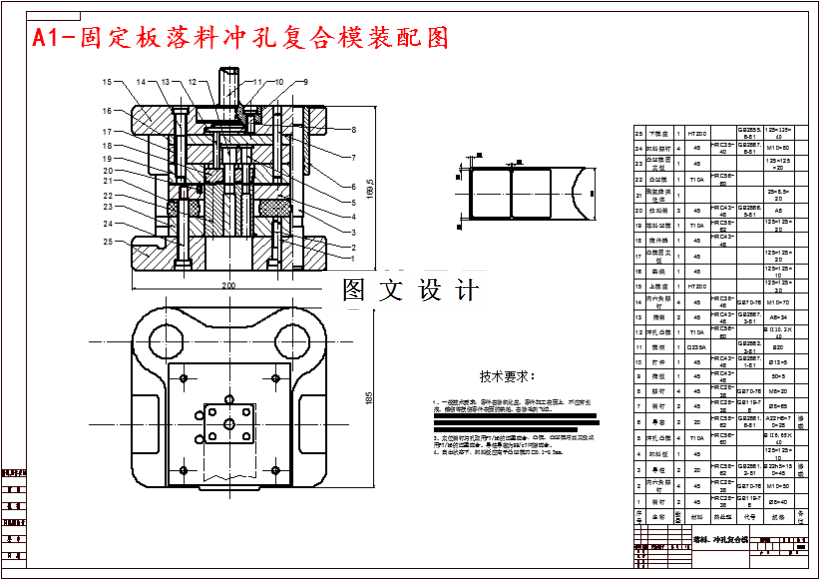 该零件材料为08钢结构简单,抗剪强度为300mpa形状对称,只有落料,冲孔两个工序具有良好的冲压性能,适合冲裁。工件结构相对简单,有一个φ10mm的孔四个φ6.5mm的孔;孔与孔、孔与边缘之间的的距离也满足要求,最小壁厚为4.25mm。该冲裁件包括落料和冲孔两个基本工序,可采用的冲裁方案有单工序冲裁,复合冲裁和级进冲裁三种: 方案一、单序模:零件属于中批量生产,因此采用单工序须要模具数量较多,生产率低,所用费用也高,不合理; 方案二、:复合模:若采用复合冲,可以得出冲件的精度和平直度较好,生产率较高,凸凹模最小壁厚为3.2mm。 方案三、级进模:大批量生产、冲裁精度较高,冲裁件孔与孔、孔与边缘尺寸较小时使用,计算该件的最小壁厚为6mm。 综上所述可选方案二复合模。