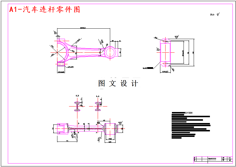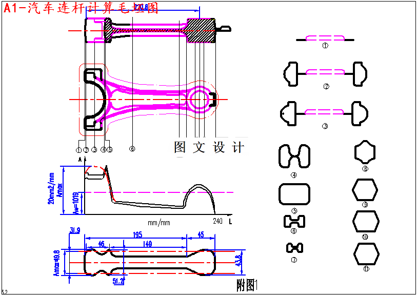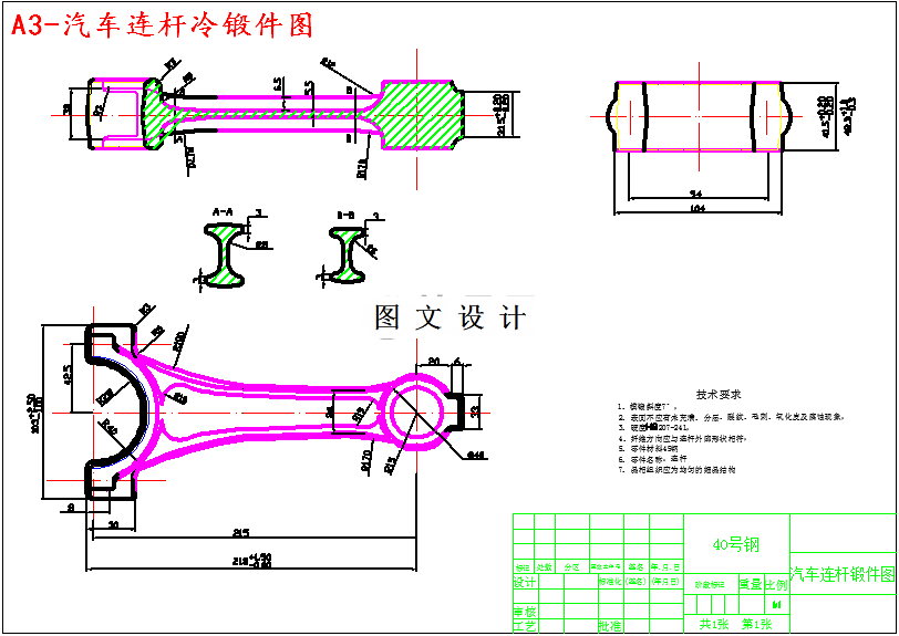 零件为汽车连杆。连杆是汽车发动机的主要零件之一,工作时在高速下运转,工作条件比较繁重,除和曲轴拐颈相连的半圆叉形部分以及通过活塞稍与活塞相连接的小头部分需机械加工外,其他工字形截面杆部等都不加工。根据连杆形状,采用上下对称的直线分模。模锻此连杆的模锻锤机组,加热炉在锤的右方,故拔长型槽布置在右边,滚挤型槽布置在锻模左边,预锻及终锻工步从左至右。