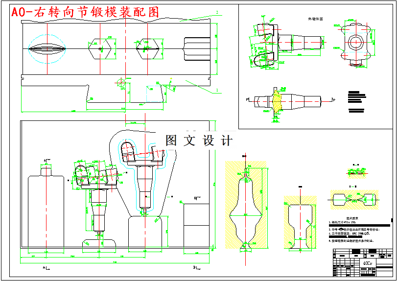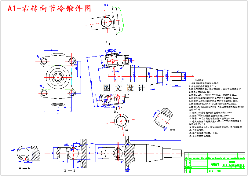 转向节的功用是承受汽车前部载荷,支承并带动前轮绕主销转动而使汽车转向。在汽车行驶状态下,它承受着多变的冲击载荷,因此,要求其具有很高的强度。对零件的整体形状尺寸,表面粗糙度进行分析:头部构造比较复杂,只能锻造出其零件基本外形,其它孔部、球形滑槽及花键槽部分均以余块填充,之后再以机械加工做出具体形状,达到要求的零件形状;零件的机械加工精度应低于Ra1.6;零件的材料为40Cr,材料性能稳定。根据右转向节形状,采用上下对称的直线分型模。知此锻件应采用拔长、滚挤制坯工步。为易于充满型槽,应选圆坯料,再拔长、闭式滚挤。模锻工艺方案为:拔长—闭式滚挤—预锻—终锻。