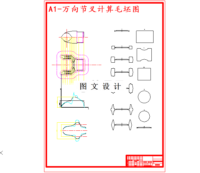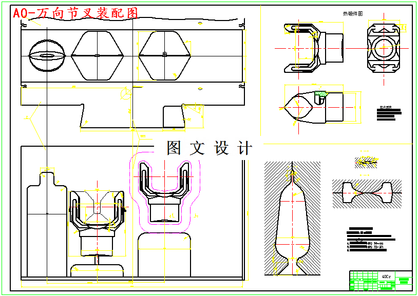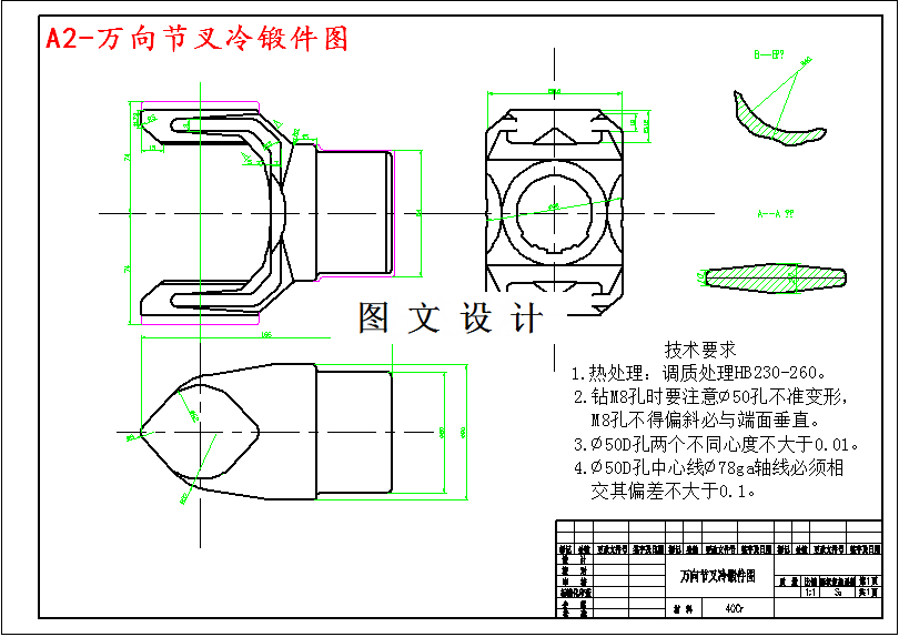 零件为万向节叉,万向节叉是叉形件。是用在解决主动轴与从动轴轴心存在一定角度,允许被连接的零件之间的夹角在一定范围内变化,承受的转矩比较大,工作条件比较繁重,在不平行的情况下起到联结主、从动轴的作用的器件,也就是通过万向节主动轴将力矩传给从动轴。除了汽车的传动装置,在其他工业甚至民用传动领域的应用范围极为广泛,基本上,只要有以下情况均可使用。对零件的整体形状尺寸,表面粗糙度进行分析:头部构造比较复杂,只能锻造出其零件基本外形,其它孔部、球形滑槽及花键槽部分均以余块填充,之后再以机械加工做出具体形状,达到要求的零件形状;零件的机械加工精度应低于Ra1.6;零件的材料为40Cr,材料性能稳定。