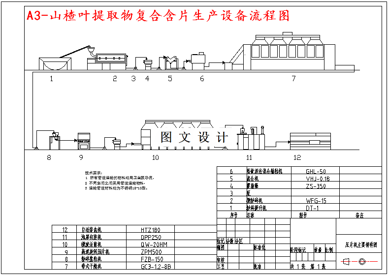 本设计通过产品方案的确定、设备选型、能耗和物料衡算等拟设计一个年处理原料500吨山楂叶提取物的山楂叶提取物复合含片生产线。本课题的研究目标是确定山楂叶提取物复合含片的最佳工艺流程和配方,为山楂叶提取物提供一条新的加工途径提供一定的理论基础。本课题主要研究以山楂叶提取物为原料,加入甜味剂、香精、湿润剂等制成山楂叶提取物复合含片,通过正交试验、对比试验,最终确定山楂叶提取物复合含片的最佳口感及最佳稳定性的工艺及配方。