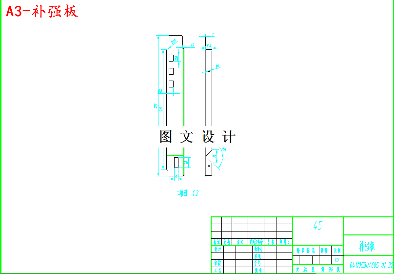 本设计分析了补强板的工艺性,利用UG绘图软件只需完成产品的三维图绘制使用CAD软件绘制全套模具图纸,确定了工序的排样方式,进行了工件展开图尺寸、冲裁力、模具刃口尺寸的计算,本次的工件需两次弯曲,第一副级进模一共有冲孔、弯曲、空工位、落料等8个工序,第二道进行L形状的弯曲。此外,详细介绍了凸模,凹模,卸料板,固定板,垫板,导柱,导套等零部件的设计和选用过程。选择了合理的压力机,并介绍了模具的安装方式。