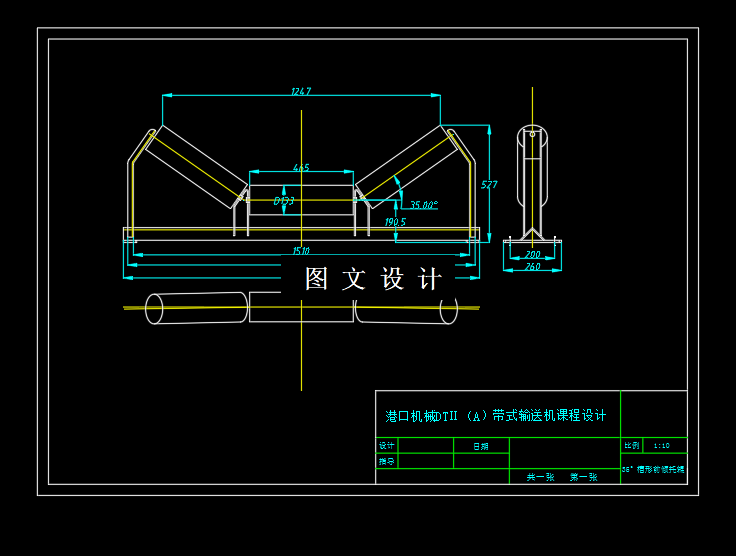 (1) 带式输送机布置形式及尺寸:根据已知的原始数据及工作条件,初定:带速v=2m/s;带宽B=1200m;可初定:上托辊间距aO=1000mm,下托辊间距aU=3000mm;初步给定设计参数:托辊辊径取133mm,采用35°槽型前倾托辊,托辊前倾1°23′托辊槽角λ=35°。(2) 输送能力Q=2260t/h; (3) 输送物料:铁矿石;粒度6~13;堆积密度2t/m3; (4) 机长:L=600m,提升高度H=36.70m,倾斜角度δ=3.5°; (5) 工作环境:海边露天作业。706328