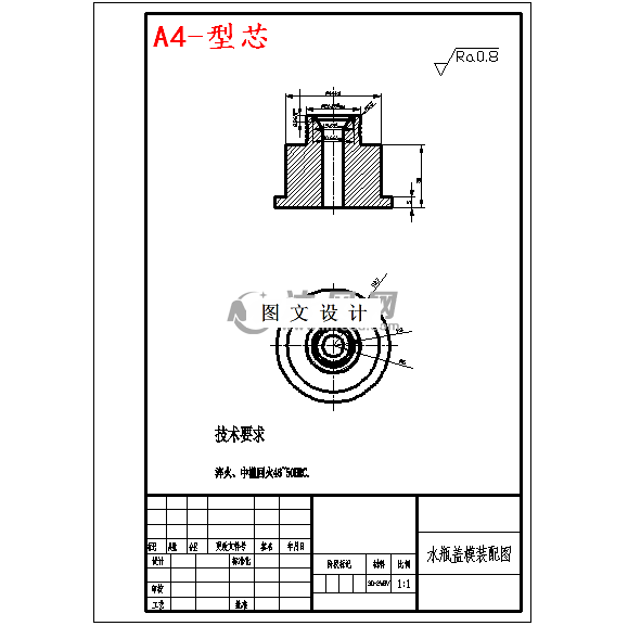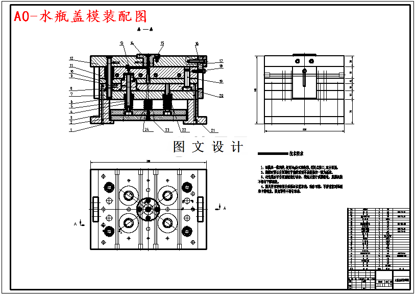本次设计为水瓶盖的注塑模具设计,将塑料原料加热成熔体后,利用注射机的推力注射入模具中,使其充满预先做好的型腔,再保压,冷却后开模取出成品塑件。主要解决了模具方案分析和确定、浇注系统设计、分型面的选择、脱模机构设计等问题。本模具为一模四腔结构,经两次分型后,塑件最终成型。