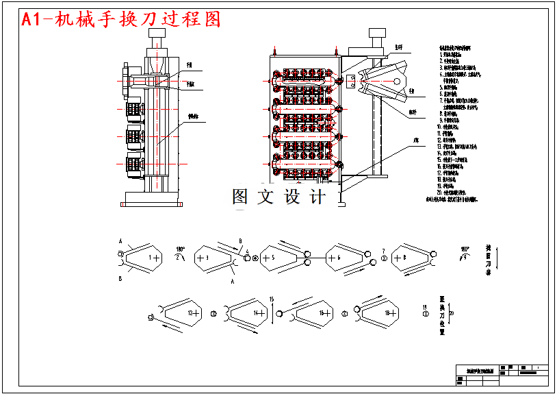 本设计介绍的是数控加工中心刀库与机械手研发与设计。加工中心它具有刀库和自动换刀装置,重点讲的是数控卧式镗铣床的换刀装置的总体设计,是用其中带有刀库式的自动换刀装置来进行分析的。它是多工序数控机床上应用最广泛的换刀装置,整个换刀的过程特别繁琐。第一步呢就是要把加工过程中需用的所有的刀具都安在一个比较合格的的刀柄上,在机床外进行尺寸的一个预调后,再按特定的方法装到刀库上去。在换刀时,要先在刀库中选择刀具,然后由机械手从刀库和主轴上取出刀具,再交换位置,把新的刀插到主轴,旧刀放回到刀库。放刀具的刀库有很大的的容量,它可以放六十把刀具,是采用链式结构,安装在机床的左侧刀库上。设计成由多环链式刀库和回转式双臂双手机械手组成。这个设计的主题就是刀具交换装置的结构设计、液压的控制。基于刀具数量、刀具直径、最大长度、最大重量的工具、工具存储空间、刀具运动线速度的可靠性,通过对存刀数、刀具最大直径、刀具最大长度、刀具最大重量、刀库安装空间、刀具最大运动线速度、刀库工作可靠性的要求以及所具有的条件的充分研究和分析,实现了刀具交换装置的总体方案的选择、总体结构设计、水力设计、以及轴、链轮、齿轮、支架、张紧装置、压盘、链板等部分结构设计、动态形式,电力传输,驱动器和运动控制类型的选择。使机构能够准确、快速、可靠地完成指定的运动。