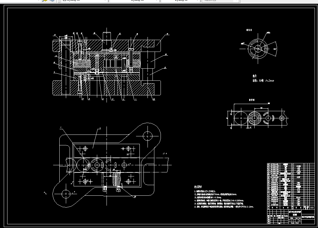 本设计重点是在分析冲裁变形过程及冲裁件质量影响因素的基础上,主要介绍冲裁件的工艺性分析、确定冲裁工艺方案、选择模具的结构形式、进行必要的工艺计算、选择与确定模具的主要零部件的结构与尺寸、校核模具闭合高度及压力机有关参数、运用cad绘制模具总装图及零件图都是这次设计的主要内容。本次设计不仅让我熟悉了课本所学的知识,而且我做了把所学到的知识运用到实践当中,更让我了解了级进模设计的全过程和加工实践的各种要点。