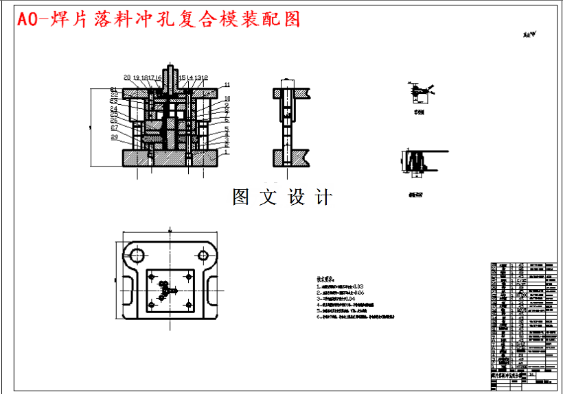 这次设计是对焊片零件进行冲压模具设计,主要内容主要有:冲压工艺方案的 选取和确定、对工件进行工艺性的分析、选择模具的结构、计算模具尺寸和设计等。运用CAD 绘图软件绘制对应的装配图以及相应的零件图。确保设计出的模具外观,质量和工艺性都复合要求。通过本次设计更好的了解到自己所学的专业知识,更充分地掌握学习技能以及 CAD 绘图软件。