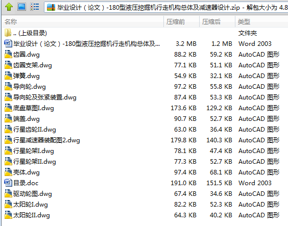 本次设计的主要内容为:180型液压挖掘机底盘总体方案设计;绘制装配草图和总装配图;动力源选择及有关参数的确定;行走装置牵引力的计算;传动方式比较与选择、传动方案的确定及传动系统的技术设计;行星减速器及零、部件的设计计算,主要零件强度校核;张紧装置、行走架和四轮一带的选型设计;绘制零、部件图和总装配图,编写设计计算说明书。