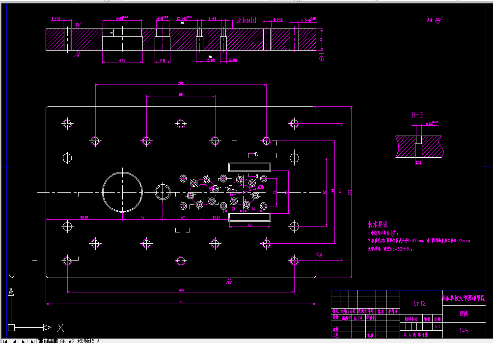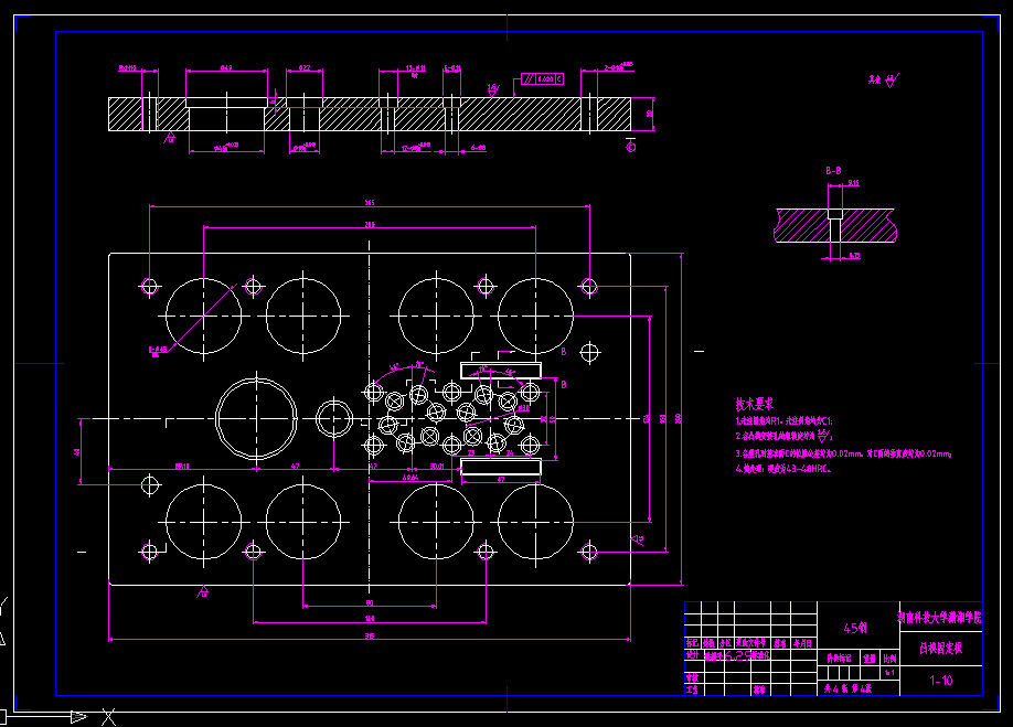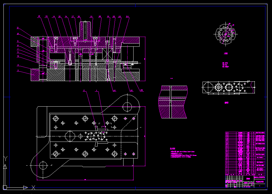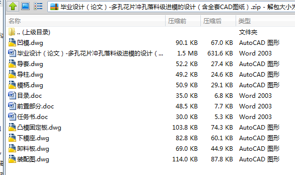 通过对多孔花片零件的冲压工艺进行了分析,确定了合理的工艺方案和冲压过程。其冲压过程:1.冲六个直径为5mm的孔,同时冲两个直径为5mm的定位工艺孔;2.冲另六个直径为5mm的孔;3.冲直径为15mm的孔;4.落料多孔花片。此连续冲压工艺可以明显的提高零件的生产率。简述了多孔花片冲模的排样图、冲压力以及压力中心等工艺计算。文中详细介绍了该级进模模具结构的总体设计及主要零部件的设计。最后,填写了冲压工艺卡和凸、凹模的机械加工工艺过程卡。
