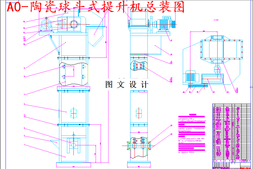 本设计满足输送陶瓷球为前提的斗式提升机。该斗式提升机适用于输送堆积密度较小易于掏取的粉状、粒状、小块状的低磨琢性物料。该斗式提升机的结构特点是:被运送物料被装入到与牵引件连结在一起的料斗内,牵引件绕过各传动链轮,形成闭合环路,连续运动输送物料。传动机构通过连轴器与头轮相连,通过连接传动使斗式提升机获得动力并驱使运转。本次设计主要针对链式提升机的整体设计, 驱动链轮的设计,电机、减速器、等主要零部件的选择及驱动轴的设计校核。优点是结构简单;占地面积小;提升高度大;密封性好,不易产生粉尘;工作平稳、噪音小、速度快。