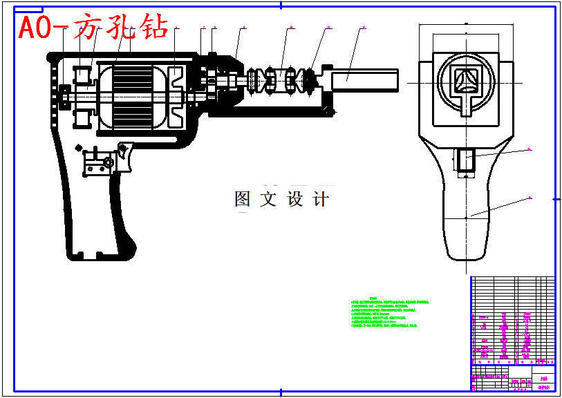 方孔钻由电动机、齿轮减速机构、外壳、开关和电源联接装置等组成,它的工作原理是:电动机高速旋转通过一对圆柱斜齿轮的减速后,驱动工作头使其作钻孔加工。本文首先通过对国内外方孔钻的比较和对方孔钻发展趋势分析,确定了方孔钻的总体设计方案和主要技术参数,然后对方孔钻各个部分的设计进行了详细说明,比如:电动机及其辅助元件的选型、齿轮传动装置设计、外壳的设计及控制电路设计,钻头的设计等,其中重点介绍了齿轮传动装置的分析、设计与计算过程,且运用了大量的图表对其进行说明。