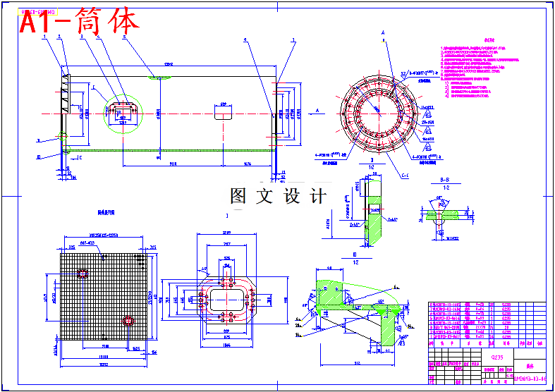 球磨机这种设备是把所需的物料破碎后再进行粉碎。筒体、进出料空心轴及磨头等部件组成了球磨机,筒体是钢板制造的圆筒,研磨体在圆筒内装着,钢制的衬板与固定在筒体内壁上,钢制圆球适合作为研磨体,筒体内部装有不同的直径、比例的研磨体,从进料端轴把需要研磨的物料装入到筒体内,当球磨机上的滚筒体开始转动,由于惯性、离心力和摩擦力使研磨体跟附在衬板上面,随着筒体回转研磨体被带走滚动,研磨体到达极限高度时被抛下,反复运动,像抛射体一样将的物料击碎。设计包括设计筒体、进出料中空轴、端盖的结构,强度校核计算,确保长期安全可靠。磨内衬板进行选型,合理地选择了研磨体的级配,用来保障正常的工作。