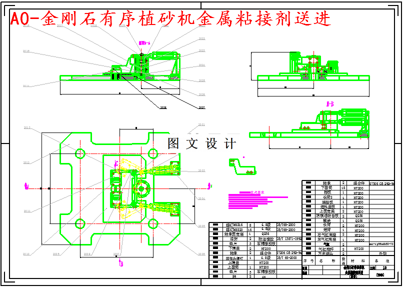 本设计用于金刚石刀具刀头部分的生产加工,采用冷压成型与有序植砂相结合的新兴技术,刀头是由金刚砂与多种金属辅料层铺而成,从而实现金刚石刀头中的金刚砂能够均匀的在胎体中分布。解决了在传统方法制造的刀具中,金刚石颗粒在刀头中随机分布,以及在刀具运转过程中每颗单独的金刚石颗粒受力不均匀的问题。提高了金刚石刀具的使用寿命和切割效率。该设计主要实现金刚石的有序植砂过程中金属粘结剂的送进和机架部分设计。