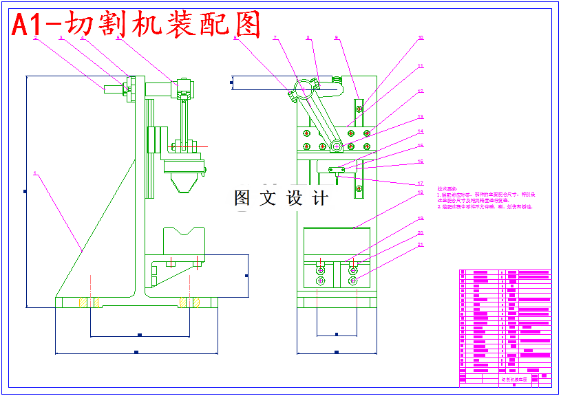 这次设计所切割的尼龙软管直径在20-30mm之间,设计这种机器的目的在于提高劳动工人生产效率和减轻他们的劳动强度,保证切割后尼龙软管的质量,为尼龙软管的发展有一定积极意义。切管机的设计方案是:步进电机提供动力,通过同步带传动传递给导向进给轮,使连接的导向进给轮通过摩擦实现尼龙管的送料,并且保证管材的精度要求;蜗轮蜗杆二级减速器带动曲柄滑块机构实现刀具上下周期性往复运动,其中根据产量要求,刀具的上下往复运动为每分钟10次 ,由此构成切割时的主运动。同时,步进电机停止转动,这样就完成尼龙软管的一次切割。因此,整个设计包括如何实现切管机的上下切割、选择合理的传动方案并且验证这种传动方案是否合理。根据已有的资料和经验公式,对传动方案进行校核和验证,除了整体方案之外还要确定零件具体尺寸和它们之间的相对位置。最后绘制切管机总装图、局部示意图以及一些重要的零件图零件图。