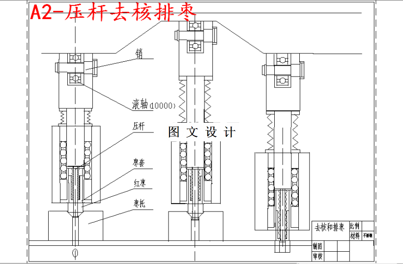 将大量红枣放到倒圆梯桶中,利用偏振片的震动将红枣一个个沿螺旋轨道送上顶端再滑到挤压机下面。挤压机呈圆形排列,下方底板有两个狭长圆形孔,一个用于去核,另一个用于排枣,装红枣的通孔可以变换大小以便于迎合枣核与枣的直径大小。利用电磁铁与板簧组合,达到红枣的自动化整理运动。利用气动或往复推压机构把红枣逐个压入旋转的去核转盘工位。利用弹簧达到压杆冲核后的自动复位。利用偏心压枣套达到红枣去核后枣肉与冲杆的自动分离!