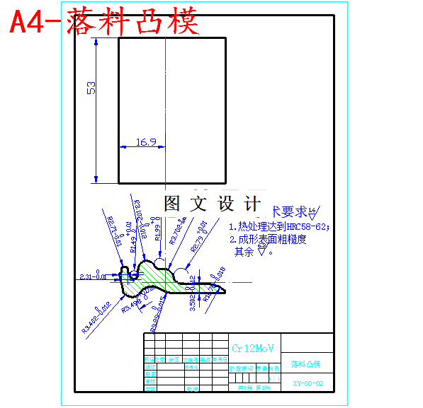 技术要求 1.压力机为开式可倾工作台压力机; 2.模座的平行度小于0.8mm; 3.模柄的中心线对上模板的垂直度不大于0.8mm; 4.导柱距下模板的距离为1mm,导套距上模板的距离为1mm; 5.为了使润滑剂流入凸、凹模刃口侧面及模具活动部分,在压料板 以及顶板内外形口部,都带倒角,使涂在冲压材料表面的润滑剂受 压后,就能沿倒角流入模具,润滑模具活动部分; 6.模柄孔直径Φ30mm,深度50mm。; 7.螺钉和销钉都选择标准件,保证螺钉拧入深度大于1.5倍的直径。 说 明 本模具是一套落料模。采用手动送料的形式,当条料 从模具右方送进时,首先依靠固定挡料销12,导料板7 对条料进行定位后落料。零件从模具下方取出。