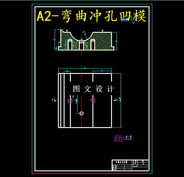 本模具是一套弯曲冲孔复合模。采用手动送料的形式,当板料从模具右方送进时,依靠承料板11辅助承接板料,以及导尺10和挡料销18的导向定位对板料进行弯曲冲孔,一次完成,因为本冲压件尺寸较大,为节省制作凸凹模的材料,所以采用镶块形式,冲孔废料从模具下方取出,采用弹性卸料装置卸料。