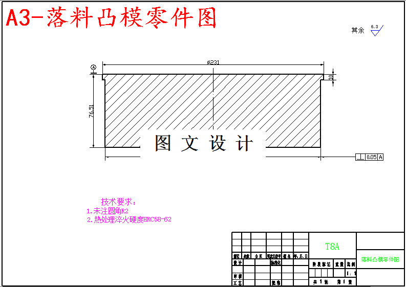 冲裁工序: 1、落料:落成225mm,厚度为2mm的圆形毛坯。 2、拉延:一次拉延即可成型。 3、翻边:外缘翻边成型。 4、校形:校形圆角及完成中心的圆锥形部分。 技术要求: 1.设备型号:机械(J)型开式压力机,公称压力400吨,封闭高度220-300mm. 模具封闭高度H=234mm,所以230mm
