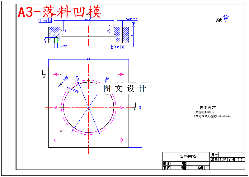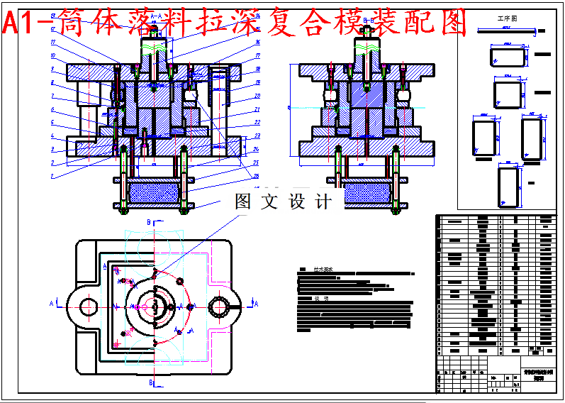 本模具是一套冲孔落料复合模。采用手动送料的形式,当条料 从模具前方送进时,首先依靠初始挡料销和导料销的定位。上模向 下行程时由冲孔凹模与凸凹模配合完成冲孔工序,由落料凹模和凸 凹模配合完成落料工序。然后条料继续向前送进,这时由固定挡料 销,导正销对条料进行定位后落料。冲孔废料和零件从模具下方取出。