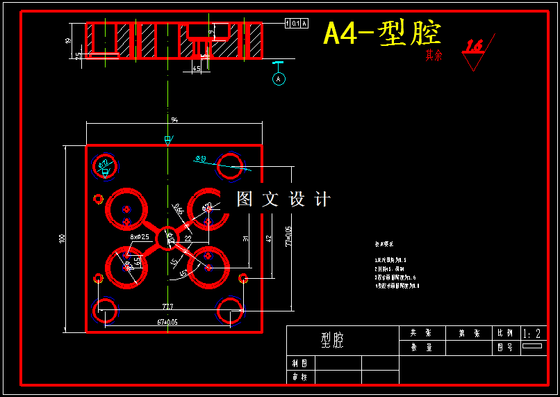 该塑件是一盖,塑件壁厚属薄壁塑件,生产批量大,材料为聚苯乙烯。 依据对塑件结构的分析,采用矩形浇口浇注,因此采用两板式分型面。初步选择一模四腔。聚苯乙烯塑性较好,采用Z形冷料穴,开模时拉料作用,然后由推杆强制推出,易于实现自动化操作。