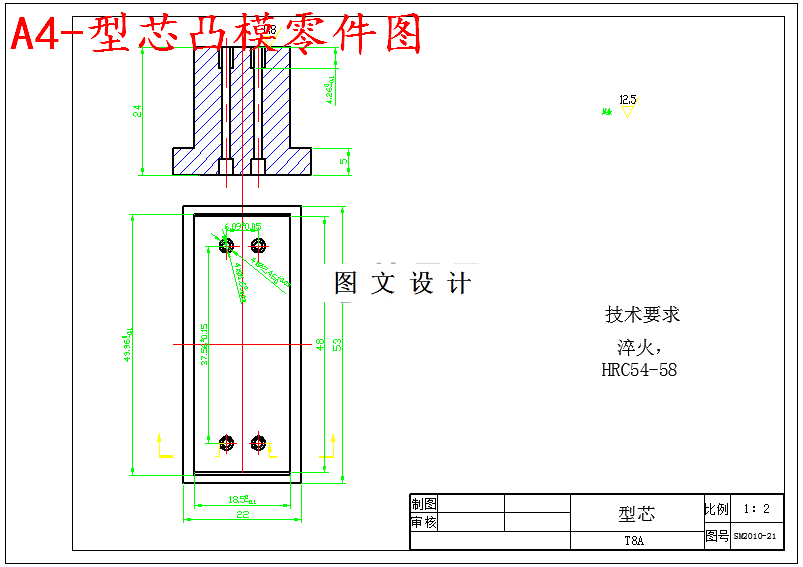 本制件的外围尺寸为57×24mm。本制件为开关盖,对之间的精度和表面粗糙度要求不高,所以取公差等级为5级,表面粗糙度为Ra 0.5 .成型方式为注射成型,一模两腔.根据塑件的结构形式,分型面选在开关盖的底平面确定型腔数 :该塑件精度要求不高,又是大批量生产.考虑到模具制造费用和制件尺寸,初定为一模两腔的模具形式. 本模具拟用一模两腔,推杆推出,浇口采用侧浇口.型芯中有四个小型腔,其中有四个小型芯一起固定在型心固定板上.