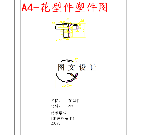 该制件为花型件,最大外形尺寸直径为40mm,壁厚为2mm,总高为25mm,有一个阶梯通孔,形状为圆形壳体。2)所设计塑件材料为ABS,此类塑料耐腐性及绝缘性能优良,具有较高的相对分子质量,密度,结晶度,熔点,刚性,强度较高,吸水性小,但为了更好的成型,所以使用之前先进行干燥。成型性能好,可以注射成型。由于ABS为结晶性塑料,流动性好,成型收缩率较大,所以采用注射成型。考虑到塑件的尺寸的问题,在此采用一模两腔。