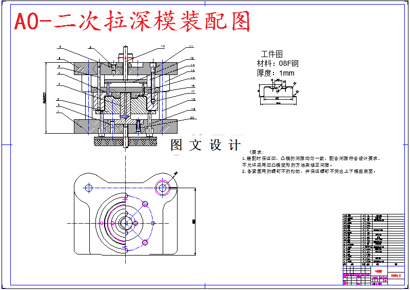 本设计主要根据给定的离合器轴承外罩零件图及其技术要求,进行该工件冲压工艺设计以及所用的冲压模具图设计。 涉及的工件主要采用的工序为落料、拉深、冲孔、切边,先设计三种工艺方案,进行比较分析,最后确定其中一套最为合理的方案进行详细的分析其工艺过程。需要对各工序的工艺尺寸进行计算,有毛坯尺寸、拉深极限、拉深力、冲孔力计算等。并设计冲压模具总装配图和模具零件图,采用CAD计算机绘图软件进行绘制。